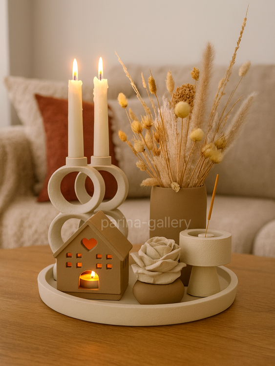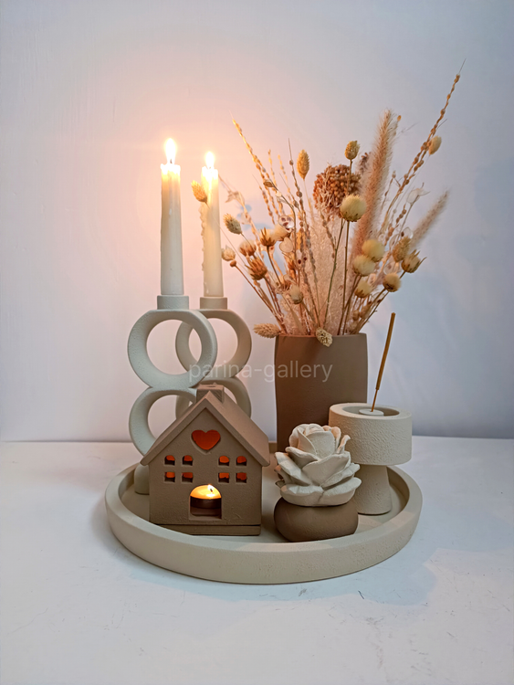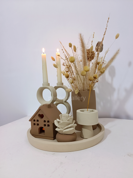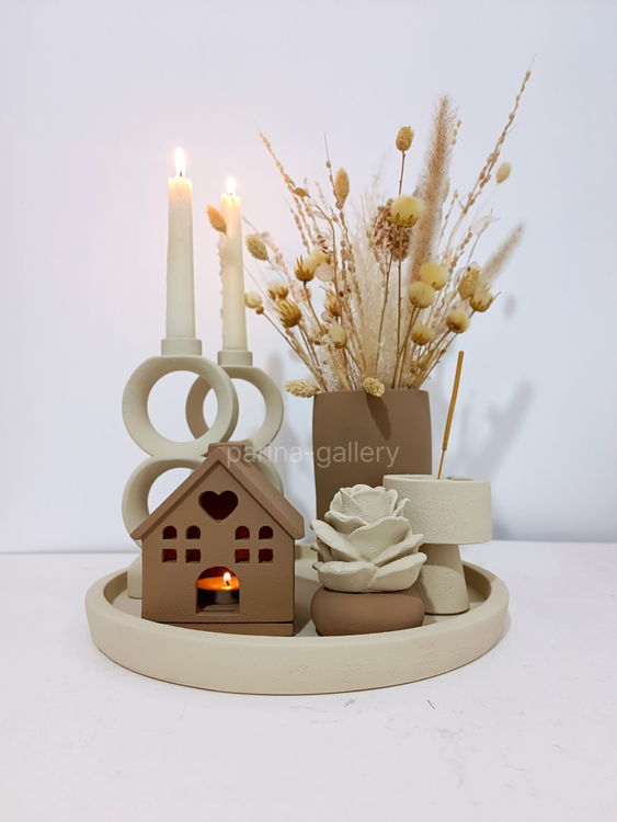 ارتفاع گلدان ۱۵ سانت . شمعدان ۱۸ سانت ، سینی ۳۰ سانت