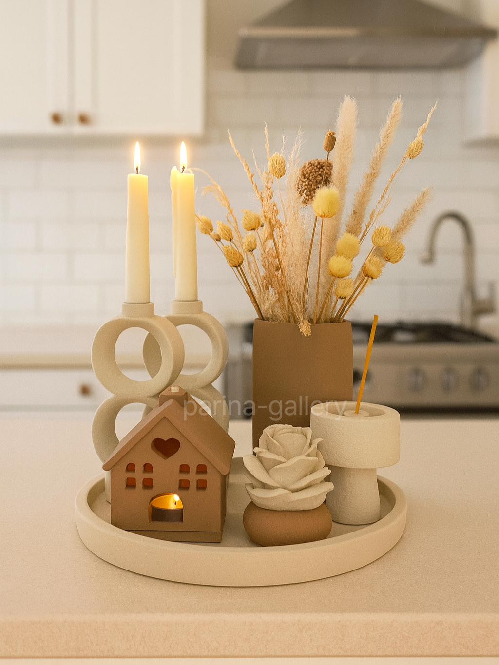 ارتفاع گلدان ۱۵ سانت . شمعدان ۱۸ سانت ، سینی ۳۰ سانت