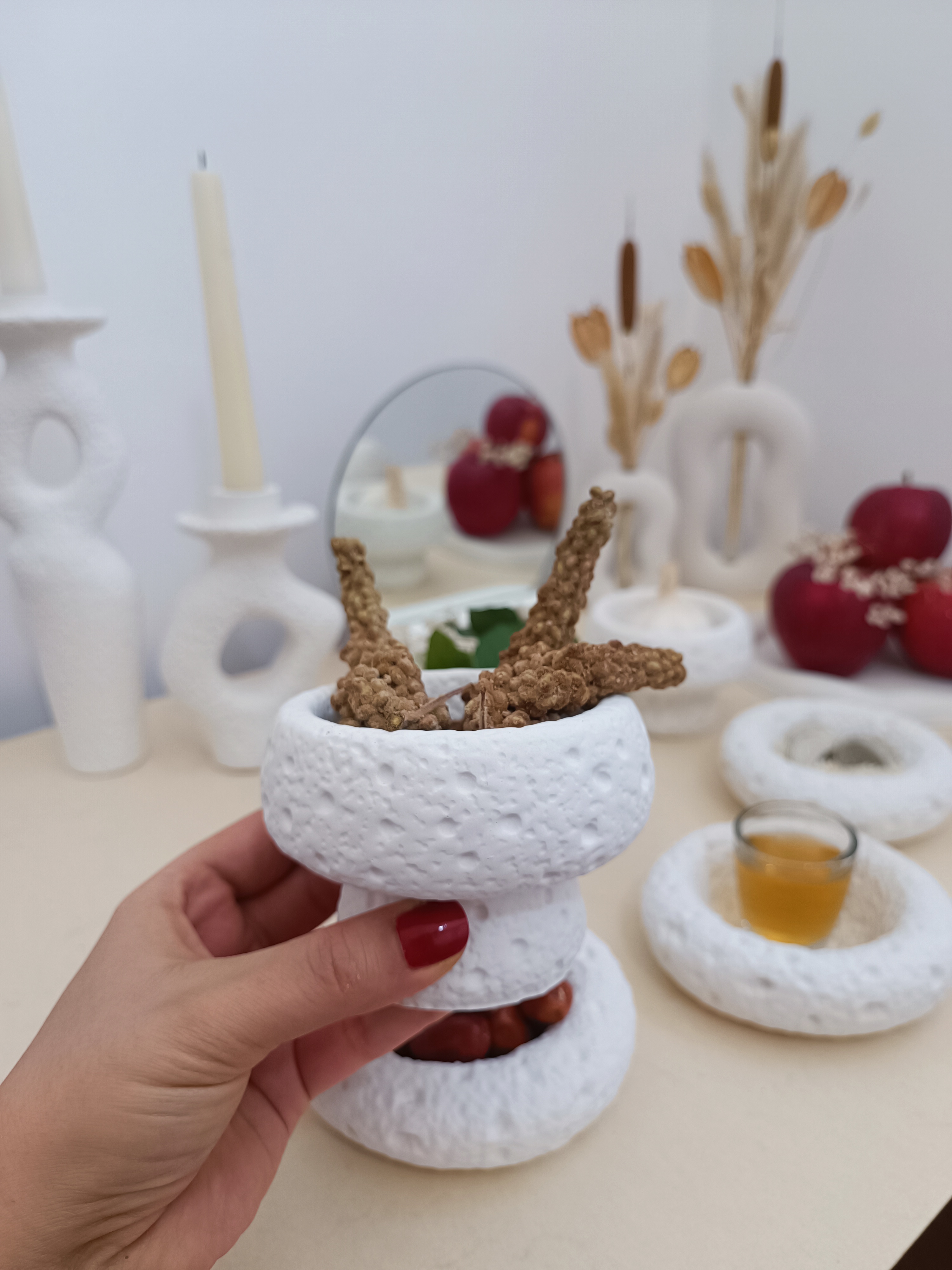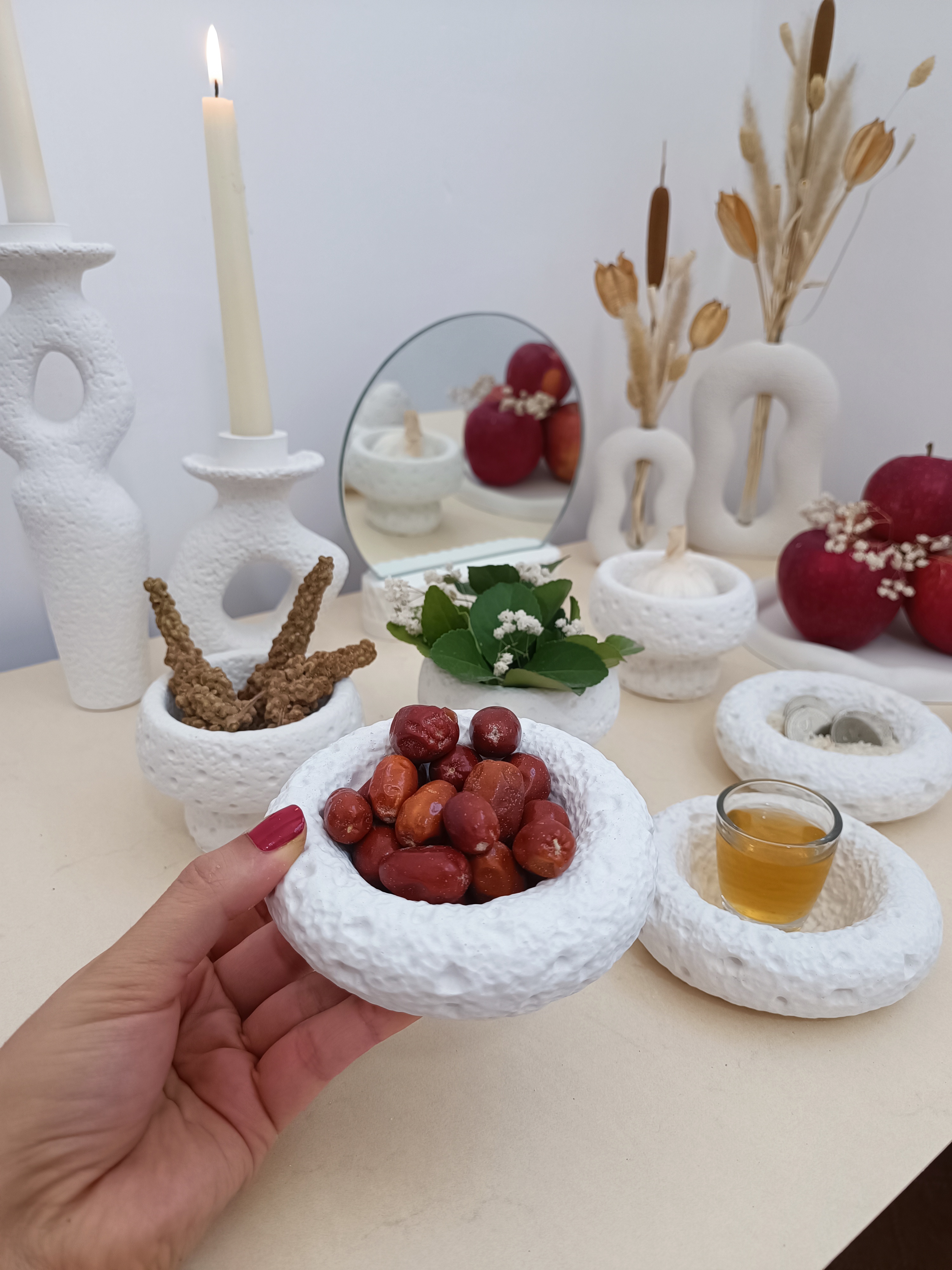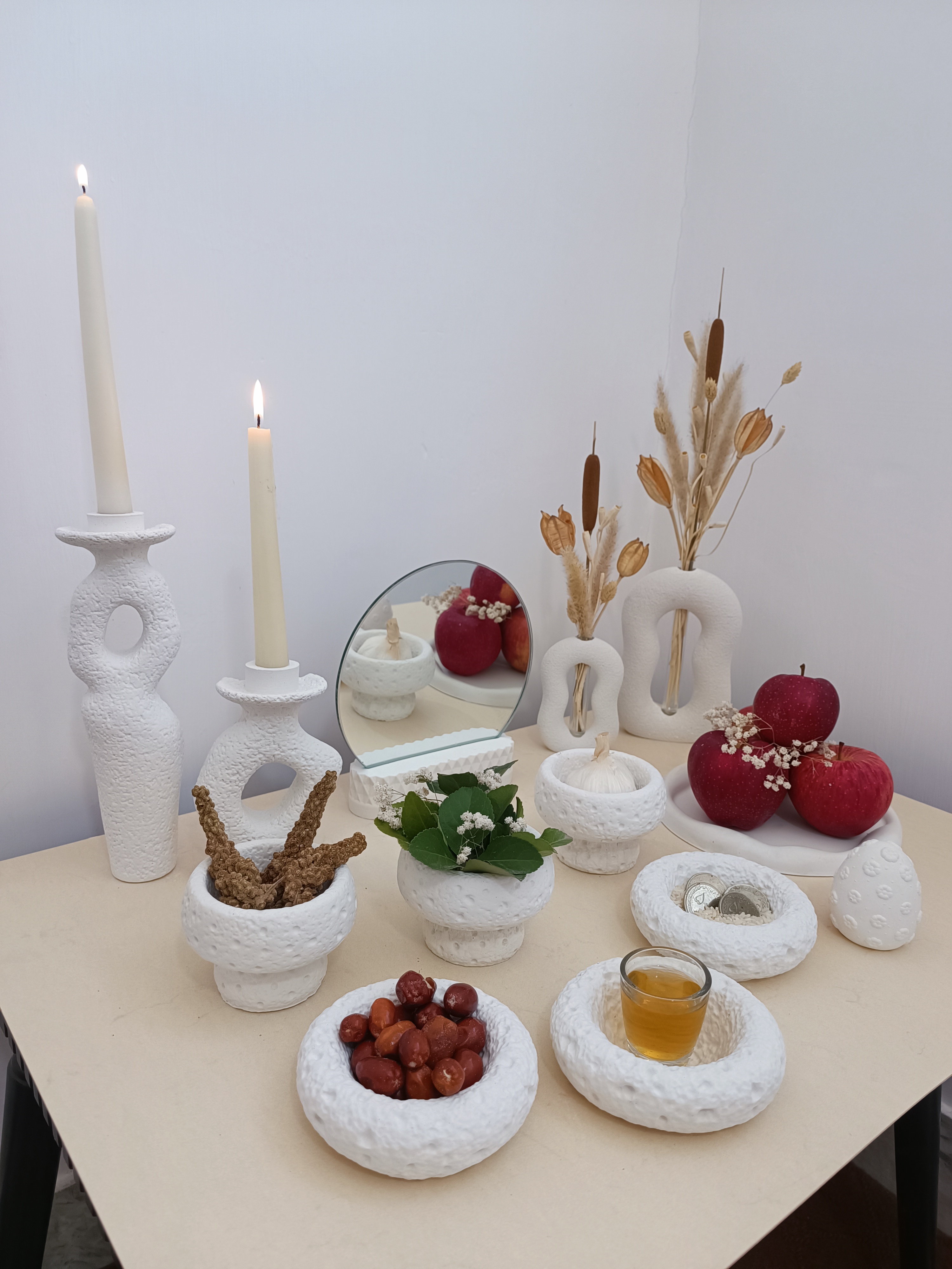 هفت سین شامل : سه عدد کاسه پایه دار ، سه عدد کاسه تخت ، دو عدد جاشمعی ، یک عدد سینی دفرمه ، یک عدد تخم مرغ ، پایه آینه همراه با آینه