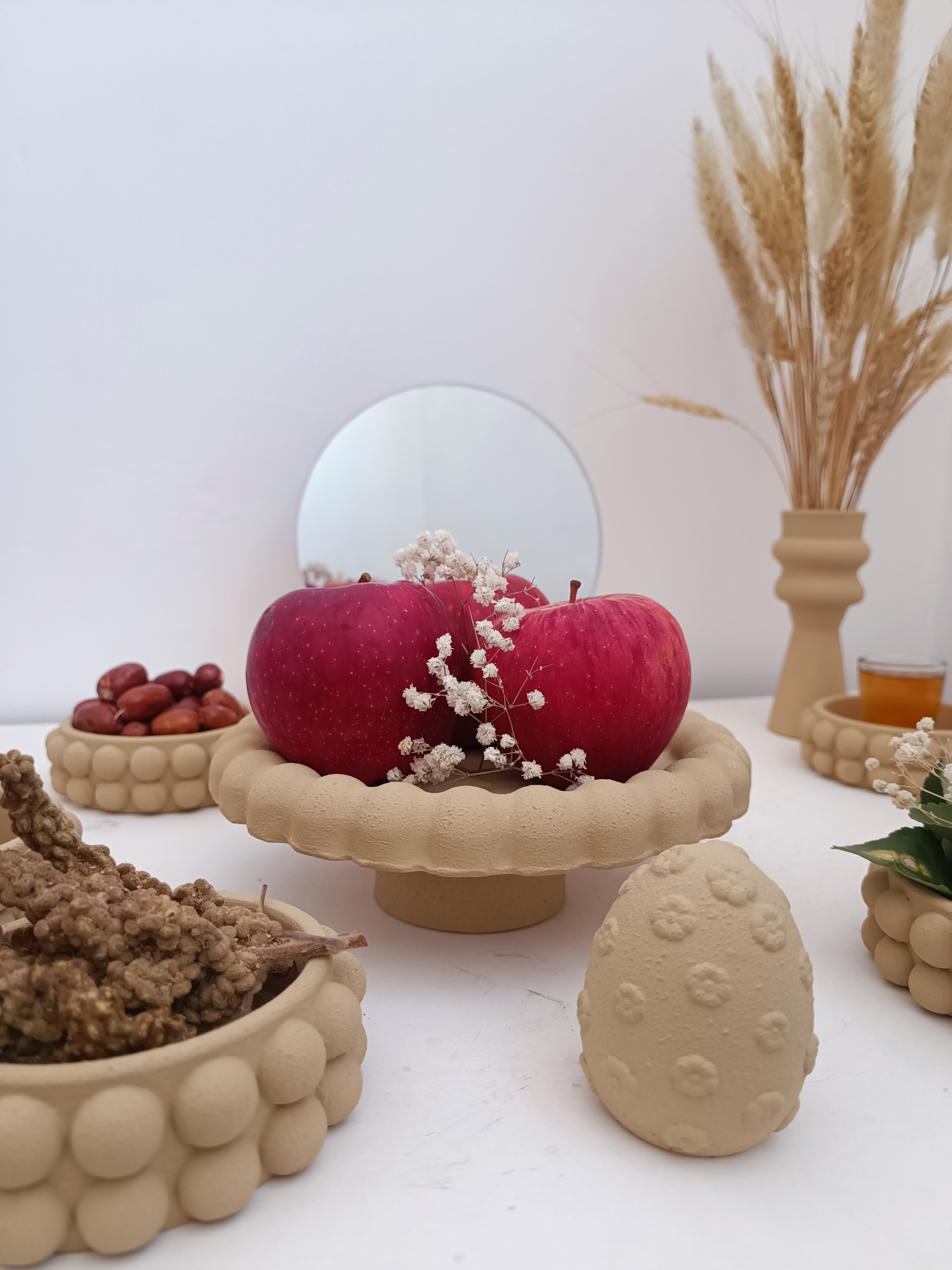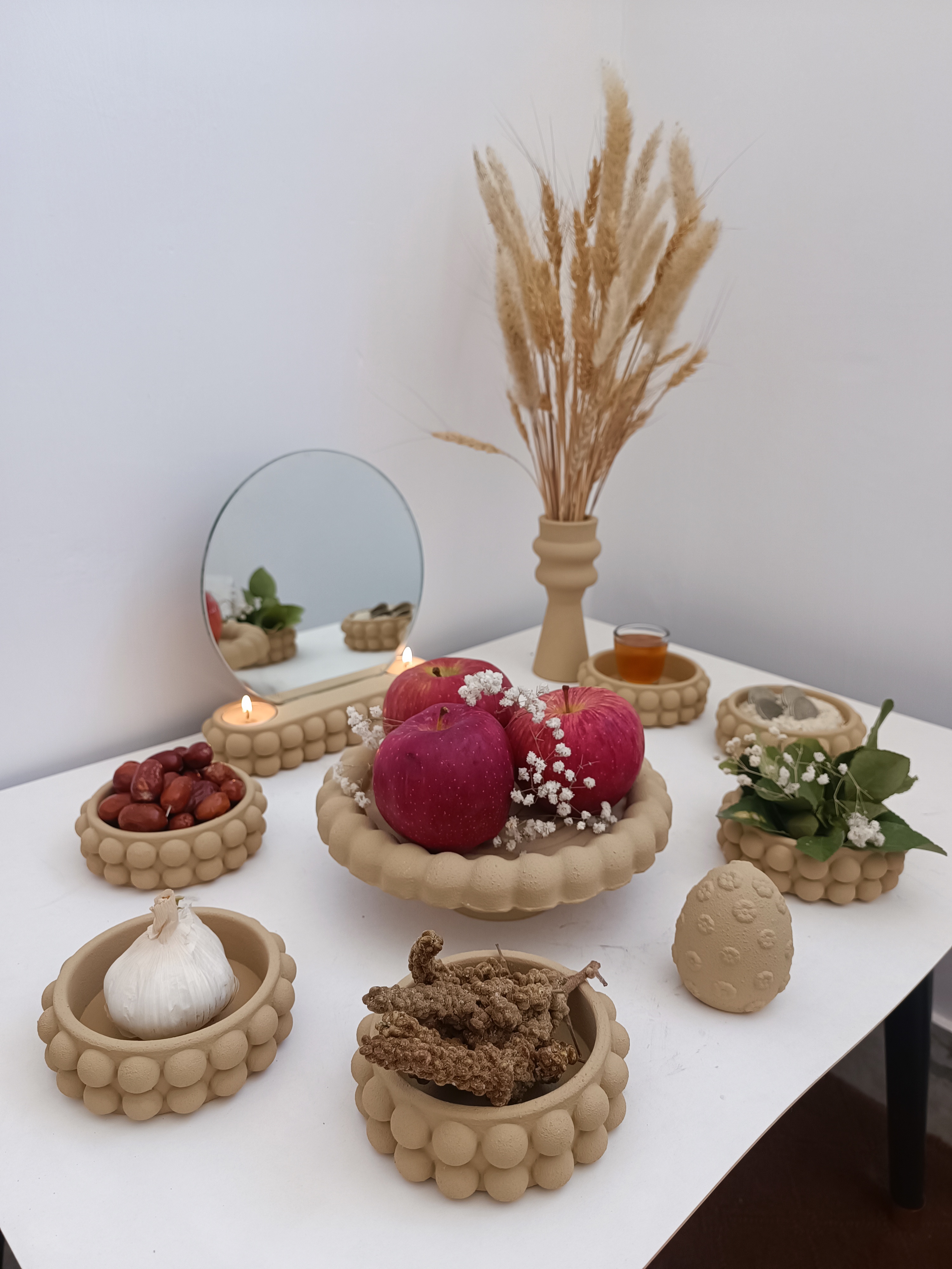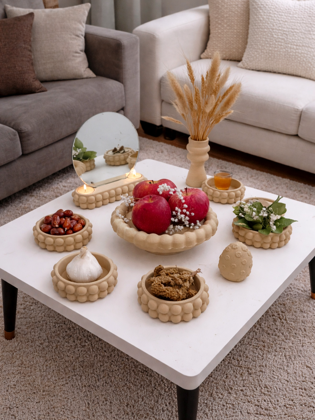 جدیدترین هفت سین 1405 سفره هفتسین امسالتو خاص و متفاوت بچین این ست شامل : شش عدد کاسه ، یک عدد ظرف بزرگ مرواریدی ، پایه آینه به همراه آینه ، یک عدد گلدان ، یک عدد تخم مرغ