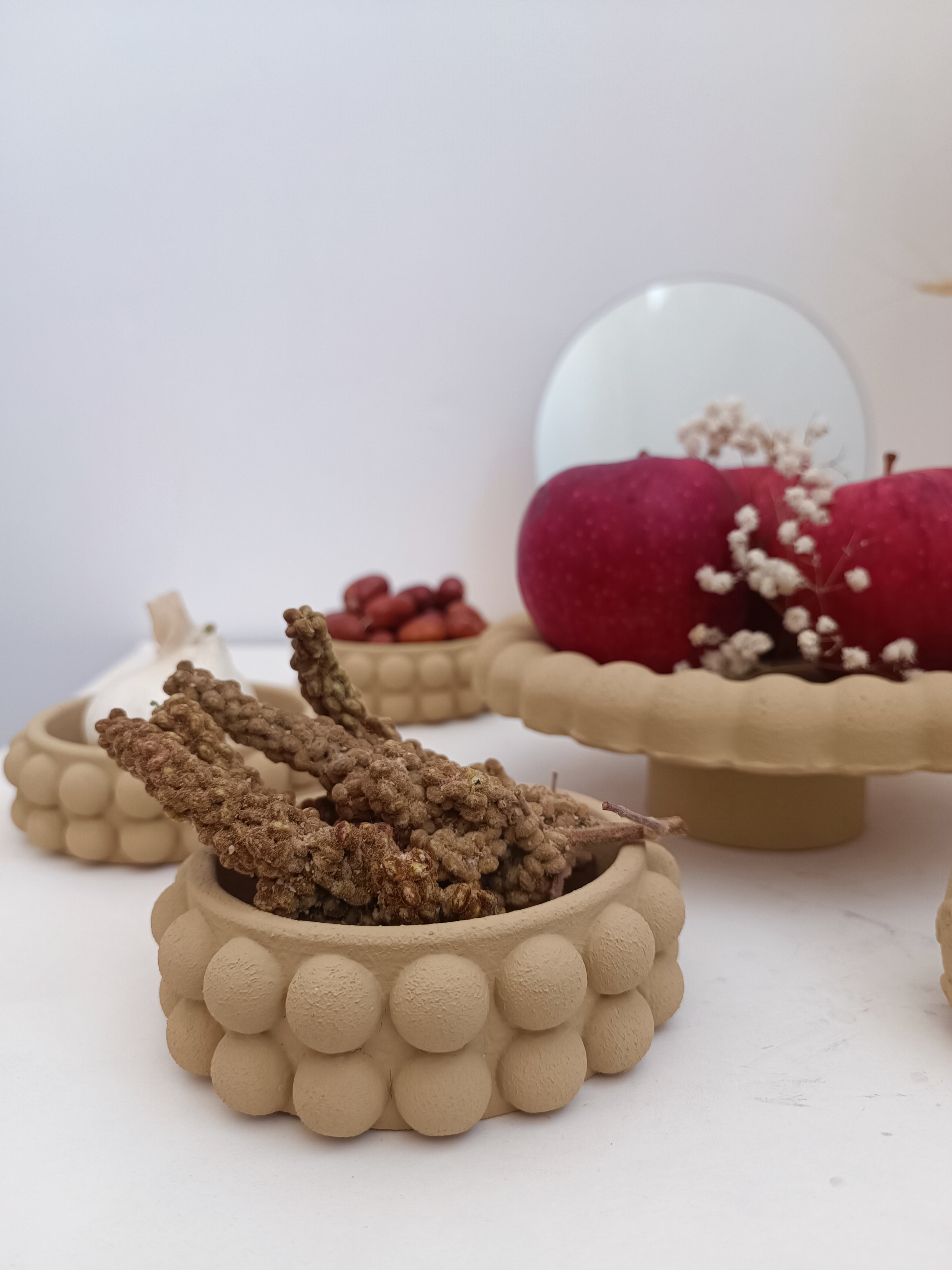 این ست شامل : شش عدد کاسه ، یک عدد ظرف بزرگ مرواریدی ، پایه آینه به همراه آینه و شمع ، یک عدد گلدان ، یک عدد تخم مرغ